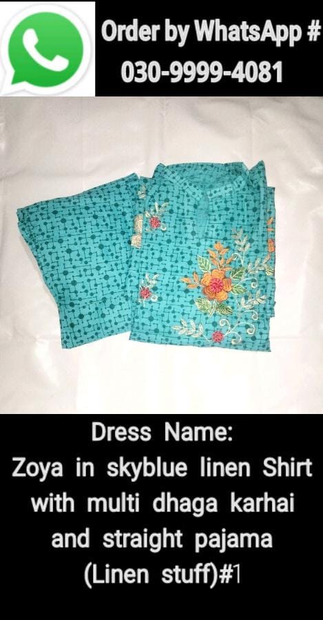 Zoya in skyblue linen shirt with multi dhaga karhai and straight pajama (Linen stuff)#1